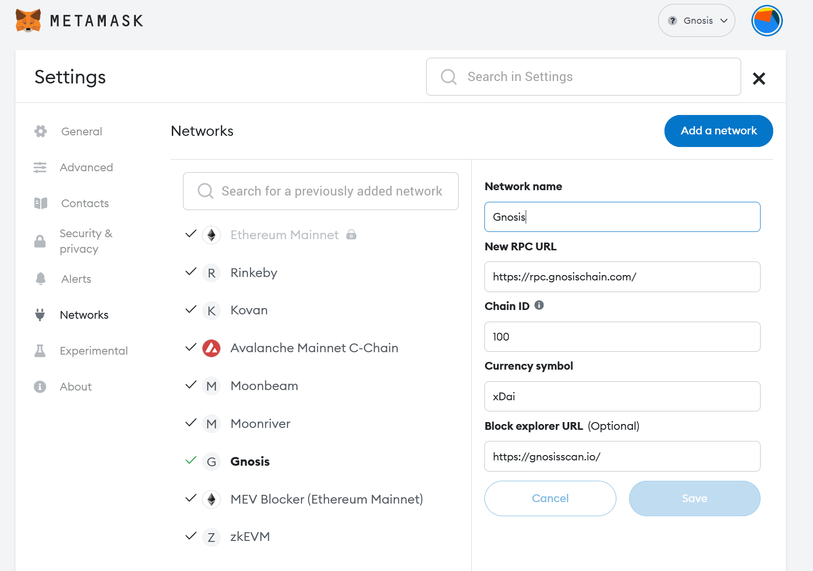 | Block Explorer URL (Optional): | https://blockscout.com/xdai/mainnet |